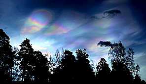 Nacreous clouds, sometimes called mother-of-pearl clouds, are rare but once seen are never forgotten. They are mostly visible within two hours after sunset or before dawn when they blaze unbelievably bright with vivid and slowly shifting iridescent colours. They are filmy sheets slowly curling and uncurling, stretching and contracting in the semi-dark sky. Compared with dark scudding low altitude clouds that might be present, nacreous clouds stand majestically in almost the same place – an indicator of their great height.