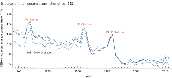 Mother-of-pearl clouds form high up, in the stratosphere, from 15-25km in height. They require extremely cold temperatures to form, below the freezing point of water, which at that height is around –85ºC. The greenhouse effect, which traps infrared radiation in the lower atmosphere and heats it, also leads to cooling of the stratosphere. It’s cooled by about 2 degrees since 1958, periodically interrupted by volcanoes whose high-altitude dust particles absorb heat: