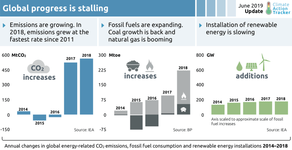 (It’s surprising to be in the same category, “insufficient”, as Australia. But Australia is a world leader in the shift to renewable energy, installing a staggering 5 to 6 GW of new wind and solar every year – three times as much per capita as the nearest competitor, Germany.)