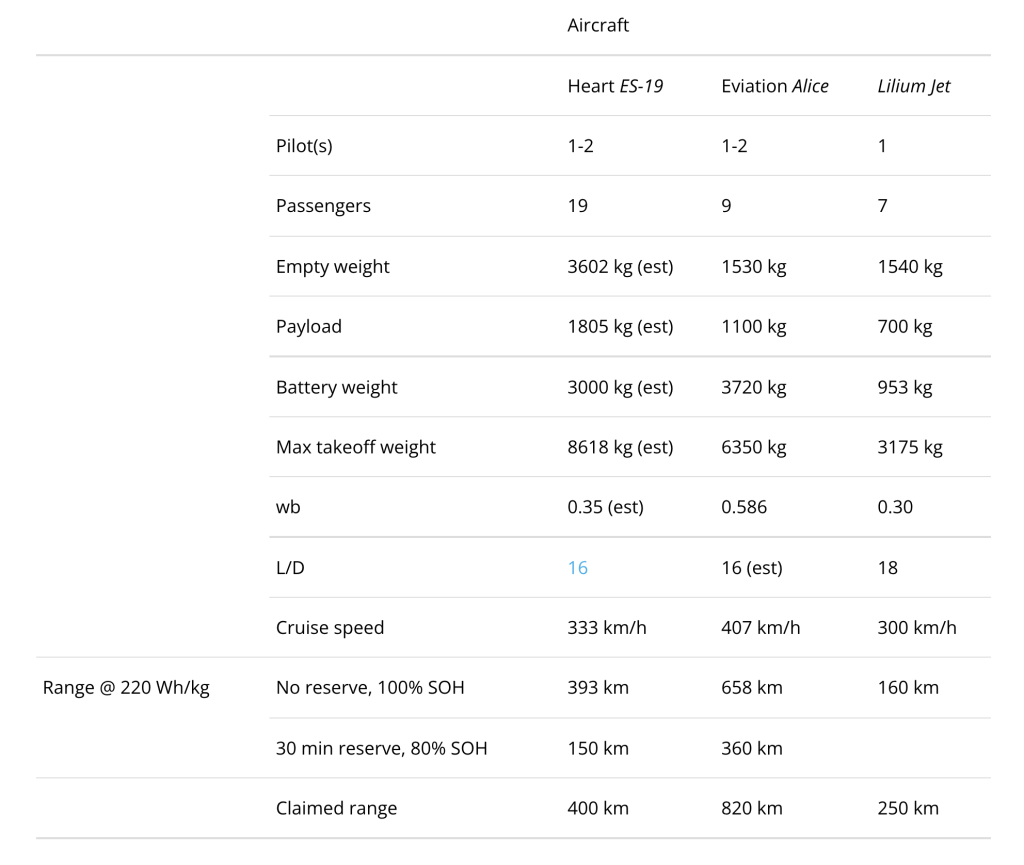 Heart Aerospace have said that the battery of the 19-passenger ES-19 weighs 3000 kg. This puts the battery at 35% of the maximum take-off weight of 8618 kg. This is also consistent with an 220 Wh/kg battery and a range chart released by the company. Together these give a range of 393 km, matching the company’s claim of 400 km. However, the reserve requirement now really eats into the possible routes, leaving only 150 km of range if a 30 minute reserve is needed.