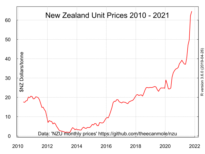 After years in the doldrums, the carbon price in the New Zealand Emissions Trading Scheme finally took off, reaching $65 by the end of the year. (In Europe, prices reached 91 euros, $156.)