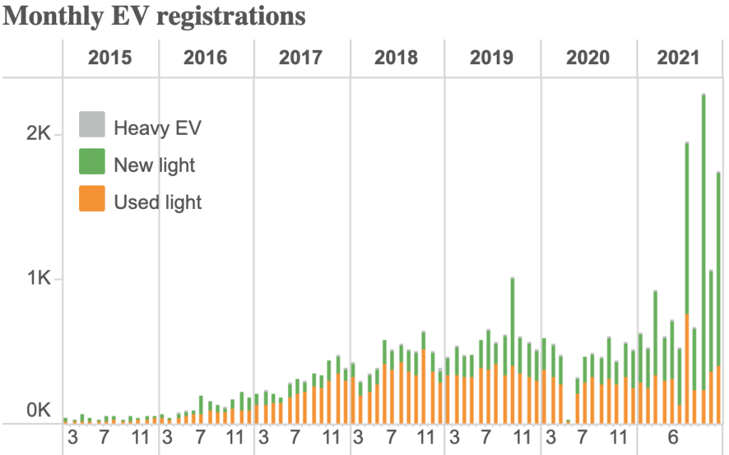The Clean Car Plan, the brainchild of Green MP Julie Anne Genter, which was to have brought in fuel efficiency standards and a system of CO2-based fees and rebates on new cars, was famously scuppered in 2020 by coalition partner New Zealand First. Freed of that shackle by the election, it resurfaced in June 2021 with a surprise twist: the rebates were front loaded and would come into effect immediately, in July. Market share for EVs jumped from 2% to 7%.