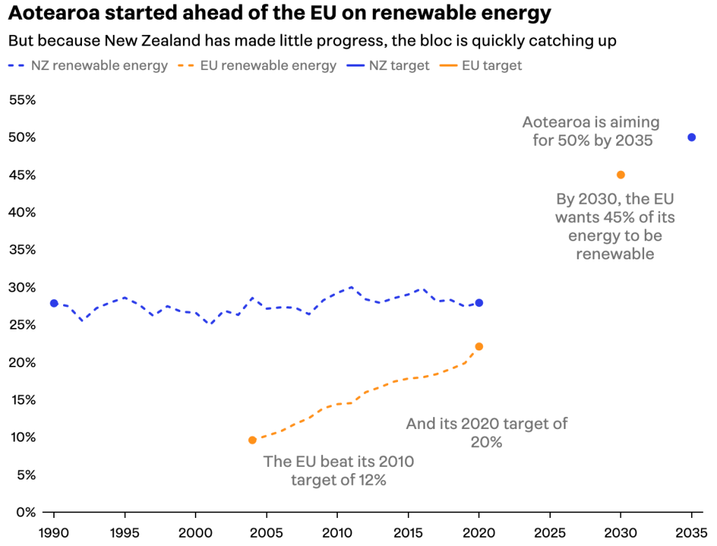 In 2020, 28% of New Zealand’s energy was renewable. That’s better than the world average of 11%, but well behind the renewable energy superpowers of Norway, Sweden, and Iceland, which are all over 70%.