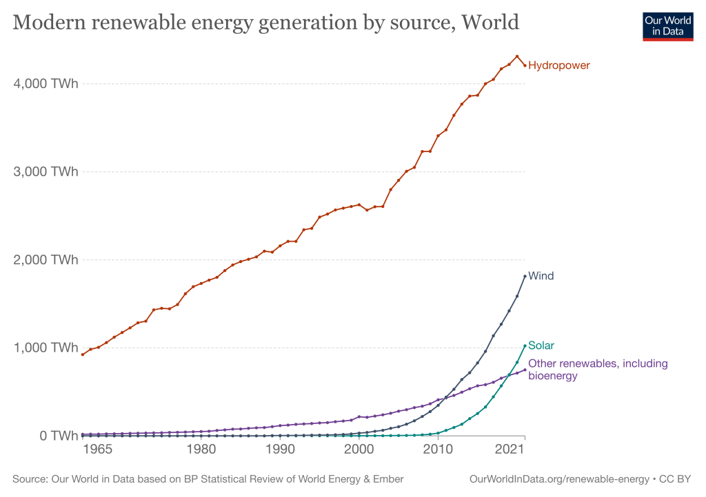At the moment, solar and wind power are increasing rapidly, contributing 2% of world energy use.