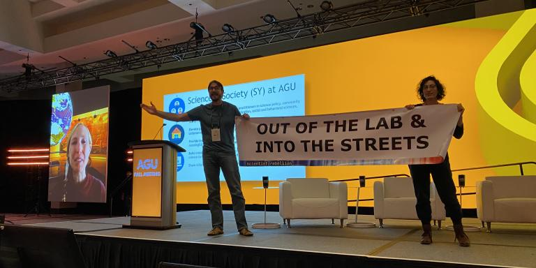 On 15 December 2022, Rose Abramoff and Peter Kalmus briefly interrupted an American Geophysical Union conference. AGU removed their research presentations from the meeting, banned them from participation, launched a misconduct inquiry, and complained to Abramoff’s employer, Oak Ridge National Laboratory. Kalmus and Abramoff further claimed that AGU threatened to have them arrested if they returned to the meeting. Abramoff was subsequently fired by Oak Ridge. In January 2023, 1500 scientists signed an appeal to object to what happened to their colleagues. Photo: Dwight Owens.