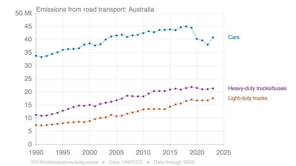 The same effect is seen for all road transport emissions (including trucks, utes, and vans). Now the picture includes an impressive result from Finland (split data not available) and even the United States. (Data for the US is for 2022 as they haven’t submitted their 2023 data to the UN yet… we can guess why.) Norway now shows only the 6th biggest drop, behind Austria, Canada, Finland, New Zealand.