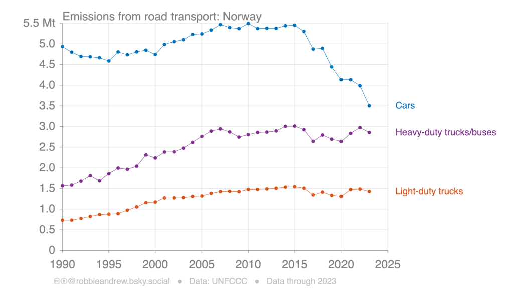 Sweden’s progress may stall as part of it was due to a strong biofuel mandate which has now been scaled back after a change of government, lowering fuel prices and increasing emissions. Norwegians are even crossing the border to get some of that cheaper fuel.