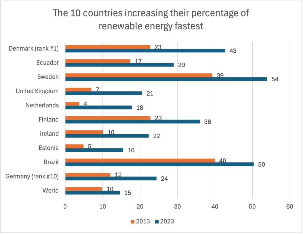 Postscript added 10 July. For another way to slice it, here are the 10 countries that have increased their percentage of renewable energy (all energy, not just electricity) the fastest, ranked by average performance over the past decade. Progress is accelerating – the average increase for 2013-2018 was 0.4 percentage points per year (top 10, 1.3%), for 2018-2023 0.6 percentage points per year (top 10, 1.8%). At that rate getting to 100% will take 150 years. The rate needs to triple (ie match the current best countries) for safety. Note that the top 10 countries are very different to each other. They are large and small, rich and poor, coming off a low or a high base. It’s easy to be discouraged looking at the scale of the task, but progress is possible.